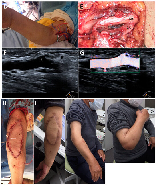 Representative case (Case 6). The patient is a 74-year-old male with rheumatoid arthritis. (A): Four years after total elbow arthroplasty, the patient developed an infection. (B): Plain radiographs show no evidence of implant loosening. (C): Despite multiple debridements and antibiotic therapy, which successfully controlled the infection, a large soft tissue defect developed on the posterior aspect of the elbow. (D): On the 14th day after the initial surgery, a free ALT flap was performed using the BA as the recipient vessel (flap size: 90 cm2). The flap pedicle vessels (dotted line) were guided through a spacious subcutaneous tunnel to the anterior aspect of the BA. (E): The flap pedicle vessels were aligned parallel to the BA and accompanying brachial vein (BV), ensuring a smooth transition towards the defect site (BA diameter: 5.5 mm, flap pedicle diameter: 1.5 mm). The anastomosed artery (hashmark) and vein (asterisk) can be seen bulging over the BA and accompanying vein. (Me; median nerve). (F): Ultrasound imaging at three weeks postoperatively shows a well-expanded anastomosis (hashmark). (G): Color Doppler imaging reveals no turbulence at the anastomosis site, with adequate blood flow in both the flap vessels and the distal recipient vessels. (H): The soft tissue defect is adequately covered by the ALT flap. (I): No postoperative complications were observed, and at the final follow-up one year after surgery, the patient had an elbow extension of −20° and flexion of 145°, with a “Good” outcome.