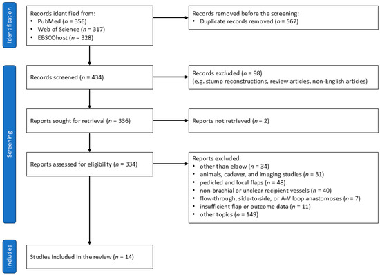 Following the PRISMA 2020 guidelines, a comprehensive literature search was conducted on 2 July 2024, using the PubMed, Web of Science, and EBSCOhost databases [29]. The search strategy included terms such as “free flap” AND “brachial artery” or “free flap” AND “elbow” to ensure the thorough retrieval of relevant case reports and publications available up to that date.