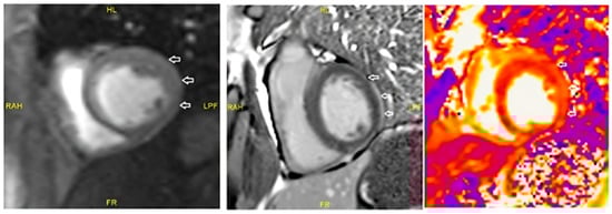 Late gadolinium enhancement observed in cardiac MRI serves as a key marker of myocardial fibrosis and plays a crucial role in the long-term prognosis of myocarditis patients. Studies have demonstrated that the presence of LGE is associated with an increased risk of heart failure, arrhythmias, and adverse cardiac events, even after the acute phase of myocarditis has resolved []. The persistence of LGE suggests ongoing fibrotic remodeling, which may contribute to ventricular dysfunction and long-term cardiac complications [].