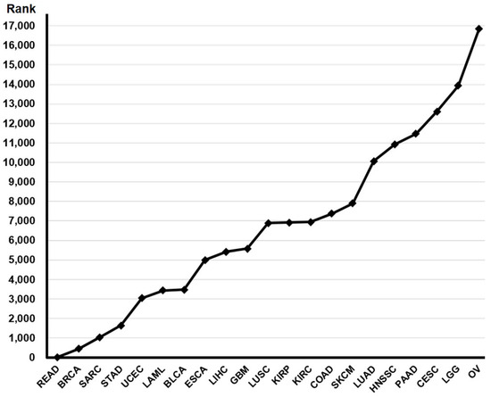 A p-value ranking for the prognostic value of VHL gene expression in various cancers. bladder urothelial carcinoma, BLCA; breast invasive carcinoma, BRCA; cervical squamous cell carcinoma, CESC; colon adenocarcinoma, COAD; esophageal carcinoma, ESCA; glioblastoma multiforme, GBM; head and neck squamous cell carcinoma, HNSC; kidney renal clear cell carcinoma, KIRC; kidney renal papillary cell carcinoma, KIRP; acute myeloid leukemia, LAML; brain lower grade glioma, LGG; liver hepatocellular carcinoma, LIGC; lung adenocarcinoma, LUAD; lung squamous cell carcinoma, LUSC; ovarian serous cystadenocarcinoma, OV; pancreatic adenocarcinoma, PAAD; rectum adenocarcinoma, READ; sarcoma, SARC; skin cutaneous melanoma, SKCM; stomach adenocarcinoma; uterine corpus endometrial carcinoma, UCEC.