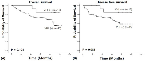 We performed survival analysis in RC to clarify the prognostic value of VHL mRNA expression. The median follow-up period was 81.96 months (range: 2–103 months). Survival analysis showed a longer OS in patients with RC with a higher VHL expression level (92.195 ± 5.376 vs. 77.592 ± 5.369 months, χ2 = 2.641, p = 0.104) (Figure 2). A higher VHL expression level had an association with longer DFS (91.010 ± 6.142 vs. 73.625 ± 5.814 months, χ2 = 3.046, p = 0.081).