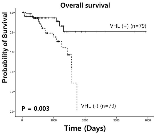 A univariate survival analysis was performed to determine the predictive value of VHL expression in RC (Figure 3). VHL expression had a statistically significant prognostic value in overall survival analysis (3341.68 ± 226.46 vs. 1326.62 ± 77.30 days, χ2 = 8.75, p = 0.003).