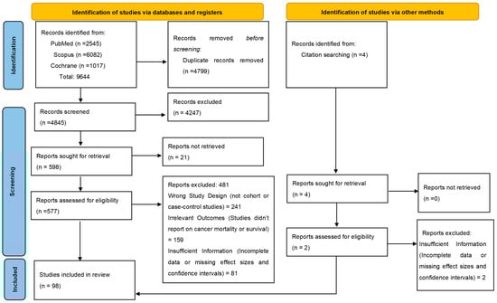 Chicago/Turabian StyleRabbani, Syed Arman, Mohamed Anas Patni, Mohamed El-Tanani, Imran Rashid Rangraze, Adil Farooq Wali, Rasha Babiker, Shakta Mani Satyam, Yahia El-Tanani, and Abdelrahman Adel Mohamed Shehata Almetwally. 2025. "Impact of Lifestyle Modifications on Cancer Mortality: A Systematic Review and Meta-Analysis" Medicina 61, no. 2: 307. https://doi.org/10.3390/medicina61020307