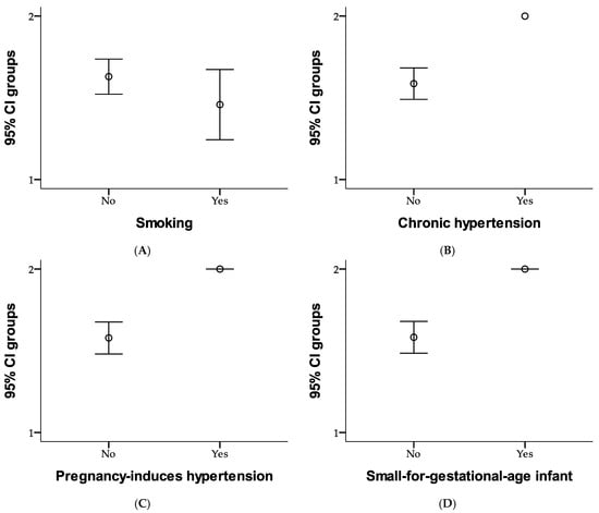 Comparison of risk factors as smoking (A), chronic hypertension (B), pregnancy-induced hypertension (C), and small-for-gestational-age infant (D) between study groups using error bar method.