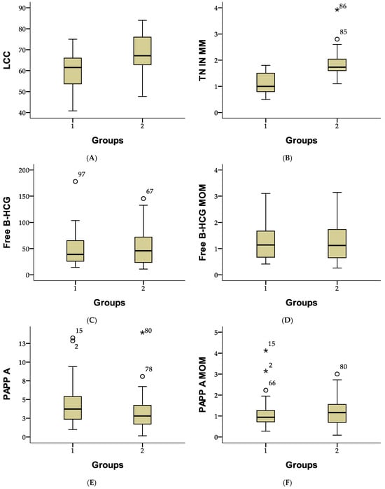 Comparison of fetal and biochemical parameters between study groups using boxplot representation. (A) Crown-rump length (LCC), (B) Nuchal translucency (TN), (C) Free β-hCG, (D) Free β-hCG MoM, (E) Pregnancy-associated plasma protein-A (PAPP-A), and (F) PAPP-A MoM. The central box represents the interquartile range (IQR), with the horizontal line indicating the median. Whiskers extend to the minimum and maximum values within 1.5 times the IQR. White circles (○) indicate mild outliers, while stars (*) represent extreme outliers.