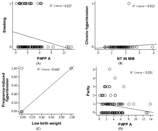Correlation analysis between clinical and biochemical parameters using scatter plots with linear regression lines. (A) Relationship between PAPP-A and smoking status, showing a weak negative correlation (R2 = 0.027). (B) Association between NT measurement and chronic hypertension, with a very low correlation (R2 = 0.015). (C) Strong correlation between pregnancy-induced hypertension and low birth weight (R2 = 0.660), suggesting a significant association. (D) Relationship between PAPP-A and parity, indicating a weak negative correlation (R2 = 0.031).