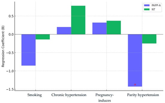 Multivariate regression coefficients for PAPP-A and NT. The red asterisk (*) denotes a statistically significant value (e.g., p < 0.05), highlighting a significant effect in the regression analysis.