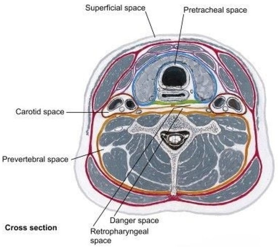 Figure 2 shows the deep neck spaces—the pretracheal space, retropharyngeal space, prevertebral space, danger space, and carotid space, and the surrounding anatomy [8].
