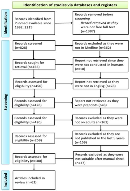We queried the PubMed database using the following keywords: deep neck infection. We obtained 2215 manuscripts from the last 30 years. Further restriction of the research to articles where the free full text was available limited the number of manuscripts to 828. A total of 466 of these articles were in the Medline database. Of these, 456 manuscripts were on human subjects, of which 428 were written in English. We also excluded preprints and obtained 420 articles. Focusing only on adult patients, we obtained 259 results. Further limiting the research to the last 5 years, we obtained 100 articles, as shown below in Figure 3.