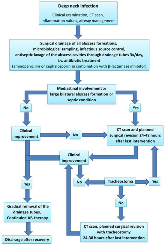 A specific general algorithm for better outcomes in the management of deep neck infections has been proposed by T. Gherke et al. in the European Journal of Otorhinolaryngology, as shown in Figure 4 [19].