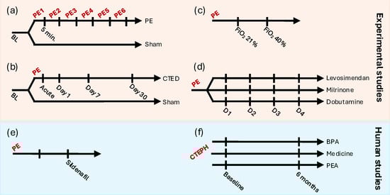 Study designs of included studies. (a) Animals were randomized to six consecutive PE inductions or sham with evaluations performed at baseline and 5 min after each induction []. (b) Animals were randomized to acute PE or sham with evaluations performed at BL and after 1, 7, and 30 days to induce CTED []. (c) Animals with PE received increased FiO2 to reduce pulmonary pressure []. (d) Animals with PE were randomized to four escalating doses (D1–4) of three different inodilators []. (e) Patients with acute, intermediate-risk PE were evaluated before and after treatment with sildenafil []. (f) Patients with CTEPH were evaluated at baseline and 6 months following either balloon pulmonary angioplasty, pulmonary endarterectomy, or pharmacological treatment only []. Abbreviations: BL, baseline; CTED, chronic thromboembolism pulmonary disease; CTEPH, chronic thromboembolic pulmonary hypertension; D, dose; FiO2, fraction of inspired oxygen; PE, pulmonary embolism; PEA, pulmonary endarterectomy.