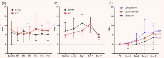 In the long-term study, PAPi also did not differ between PE and sham animals during the 30-day follow-up (p = 0.242, Figure 2b). The neutral finding was explained by an increase in both PASP (54 ± 8 vs. 29 ± 5 mmHg, adjusted p = 0.009) and PADP (24 ± 5 vs. 11 ± 3 mmHg, adjusted p = 0.002) in the acute phase after PE induction but with a concomitant increase in RAP (6 ± 2 vs. 3 ± 1 mmHg, ANOVA p = 0.0064, adjusted p = 0.121).