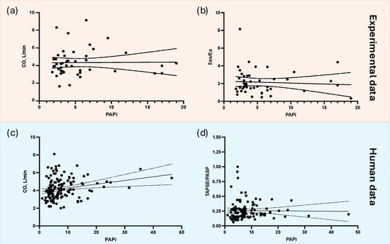 The present post hoc study analyzed the PAPi in the experimental and human studies of acute PE and CTEPH. In our experimental model, the PAPi did not distinguish between the experimental PE and sham in the acute or prolonged phase but did change with afterload reduction or positive inotropic support. In humans, the PAPi did not change significantly following interventions. In both species, the PAPi did not correlate convincingly with CO or measures of RV-PA coupling. In humans, though, we used the TAPSE/PASP ratio as a surrogate marker for RV-PA coupling as it is clinically relevant and more available than gold-standard invasive pressure–volume loop measures (Figure 3, Table 2).