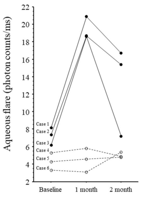 Changes in aqueous flare values in six patients. Cases 1–3: Patients with intraocular inflammation (solid line). Cases 4–6: Patients with non-intraocular inflammation (dotted line).