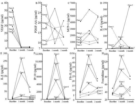Changes in levels of eight cytokines in six patients. Cases 1–3: Patients with intraocular inflammation (solid line). Cases 4–6: Patients with non-intraocular inflammation (dotted line). (A) Vascular endothelial growth factor, (B) platelet-derived growth factor AA, (C) monocyte chemoattractant protein 1, (D) interleukin (IL)-6, (E) IL-8, (F) interferon-inducible 10 kDa protein, (G) Fms-related tyrosine kinase 3 ligand, and (H) fractalkine.