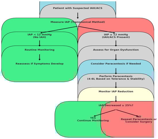 Based on these findings, a structured approach to IAH management is critical to preventing AKI progression. In addition to therapeutic paracentesis, optimizing fluid balance and monitoring biomarkers (NGAL, KIM-1) should be integrated into clinical practice. Figure 2 illustrates a practical algorithm outlining stepwise actions based on IAP severity to mitigate AKI risk and guide early intervention.