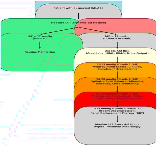 IAH is a pathological condition characterized by elevated IAP, which can progress to ACS. ACS is defined by a sustained IAP exceeding 20 mmHg, leading to organ dysfunction or failure. Early recognition and timely intervention to reduce IAP are crucial to prevent organ injury and improve clinical outcomes. In ACS, increased IAP impairs renal venous return and reduces cardiac output, contributing to the development of AKI and exacerbating systemic hemodynamic instability. Management strategies include regular monitoring of IAP, optimizing fluid balance, and, when necessary, surgical decompression. Prompt diagnosis and appropriate treatment are essential to mitigate the high morbidity and mortality associated with ACS [19,20,21].