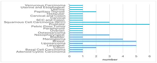 A total of 45 oncological patients were treated with HBOT and included in this study. Forty-six patients met the inclusion criteria; however, one patient was excluded from the study due to missing data. The median age of the patients was 64 years (range: 32–81), with 27 (60%) males and 18 (40%) females. The types of cancer diagnosed in the patients are summarized in Figure 1. All patients received HBOT, with a median of 27 sessions (range: 5–81). The HBOT indications are presented in Table 1.