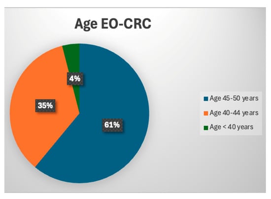 Most patients with EO-CRC (61%) fell into the 45–50 age group. This validates the data in the literature, which suggest that CRC screening in the 45–50 age group could have a significant impact on patient prognosis []. Additionally, screening and endoscopic polypectomy in younger adults may also provide benefits for the 50–55 age group, considering the average progression time from adenoma to carcinoma of approximately 10 years [,].
