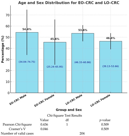 Sex distribution of patients included in the study. This figure illustrates the distribution of patients according to gender, comparing EO-CRC and LO-CRC cases. Data are expressed as percentages (95% CI—95% confidence intervals).