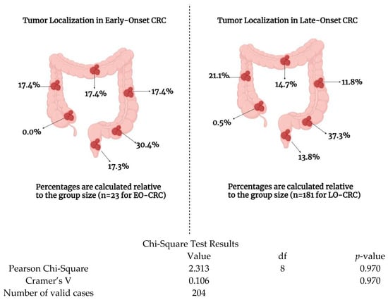 Tumor localization of patients included in the study. This figure illustrates the anatomical distribution of colorectal tumors in patients, comparing early-onset colorectal cancer (EO-CRC) and late-onset colorectal cancer (LO-CRC).