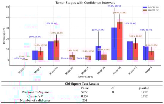 Distribution of patients by tumor stages, presenting 95% confidence intervals (CIs). This figure illustrates the distribution of colorectal cancer stages among patients, comparing EO-CRC and LO-CRC.