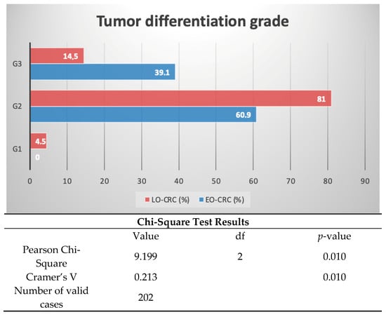 The majority of CRC patients, regardless of study group, presented with moderately differentiated tumors. However, we identified a significantly higher proportion of poorly differentiated tumors among EO-CRC patients compared to LO-CRC patients (39.1% vs. 14.5%; p = 0.010). These findings are consistent with the previously mentioned results and align with the literature [,,,,]. For instance, Hashmi et al. reported grade 3 differentiation tumors in 44.1% of EO-CRC patients and only 11.9% of LO-CRC patients [].