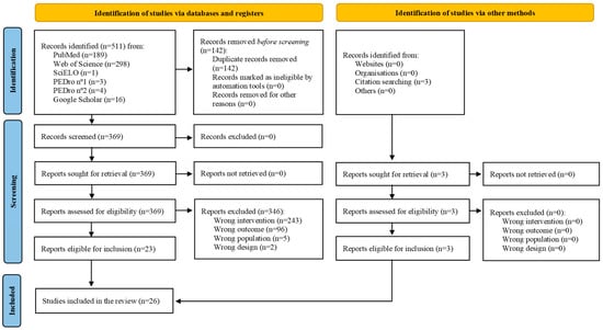 Twenty-six articles were ultimately included: five were systematic reviews with meta-analysis [,,,,], four were systematic reviews [,,,], and 17 were narrative reviews [,,,,,,,,,,,,,,,,]. Additional information is included in Figure 1.