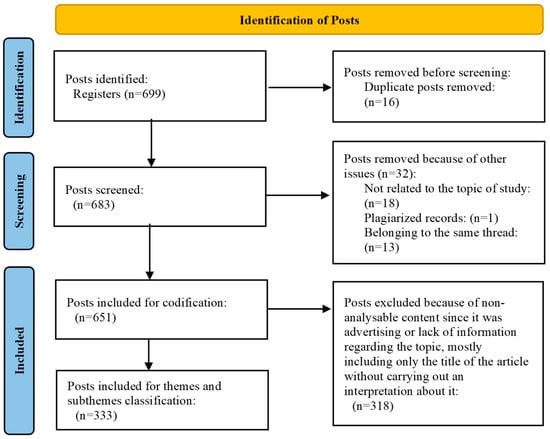 Post identification, screening, and eligibility processes are described in Figure 2. A total of 651 posts were included for code classification; after removing the posts with codes 4 and 6, a total of 333 posts were included for theme and subtheme classification. The collected posts were published between 17 August 2009 and 5 November 2022.