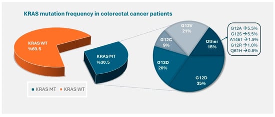 KRAS mutations are observed in approximately 45% of patients diagnosed with advanced CRC, whereas these mutations are detected in 15–37% of early-stage cases [46,47].