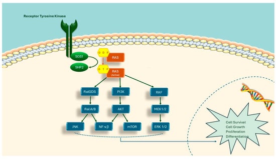 KRAS protein acts as an endogenous nucleotidase, guanosine triphosphatase (GTPase), that interacts with receptor tyrosine kinases on the cell membrane, leading to cell proliferation and inhibition of apoptosis, switching between inactivated GDP-bound and active GTP-bound forms [19]. Most KRAS somatic mutations disrupt endogenous GTPase activity, causing an increase in RAS-GTP [19]. The increase in the active GTP-bound form plays a role in carcinogenesis by activating effector proteins such as RAF-kinases, phosphatidylinositol 3-kinase (PI3K), and RalGDS. KRAS activating mutations also, play an important role in the EGFR signaling pathway by activating the RAS/RAF/MAPK signaling pathways and causing loss of EGFR regulation (RAS signaling pathways are shown in Figure 2) [20]. Since RAS mutations are so common in the pathogenesis of many cancers and remain an area of active investigation regarding prognostic and predictive significance, as well as their potential as therapeutic targets, the RAS Initiative project, supported by the National Cancer Institute (NCI) in the USA, was launched in 2013. The main goal of this project is to unite the community and provide shared resources to create a greater focus on understanding RAS biology and foster innovation, advancing drug development through cutting-edge science. As part of this project, the production, purification, and determination of the crystal structure of fully processed KRAS4b, a splice variant of KRAS, provided critical insights. KRAS4b has been linked to larger tumor sizes and a worse prognosis compared to KRAS4a [21]. Other studies conducted by this project include: “Structural dynamics of RAF1-HSP90-CDC37 and HSP90 complexes”, “Revealing the mechanism of action of a first-in-class covalent inhibitor of KRASG12C (ON) and other functional properties of oncogenic KRAS by (31)P NMR”, “RAS and SHOC2 roles in RAF activation and therapeutic considerations” [22,23,24]. To date, this project team has made substantial contributions to the literature, publishing numerous articles, significantly enhancing our understanding of KRAS [25,26,27].