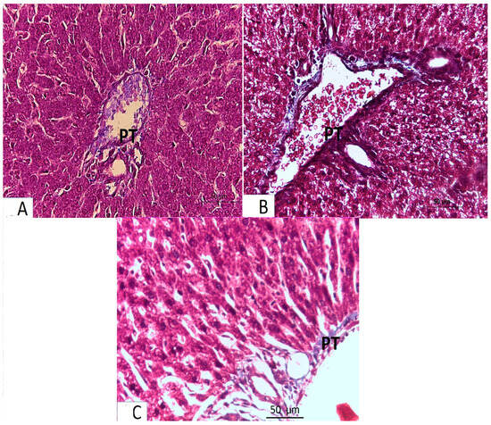 - An analysis of the stained liver sections of the treated pregnant rats (the azithromycin-treated group) (H–E) revealed that the hepatic cords lacked the typical radial arrangement. Some of the blood sinusoids seemed clogged. The majority of hepatocytes contained cytoplasmic vacuoles with the nucleus displaced to the periphery; some of the nuclei were tiny and stained deeply (Figure 1B and Figure 2B,C). The portal tract showed lymphocytic infiltration (Figure 2B,C). Collagen fibers were more widely distributed around the portal tract’s components and in the blood sinusoids’ walls, according to Masson’s trichrome staining (Figure 3B).
