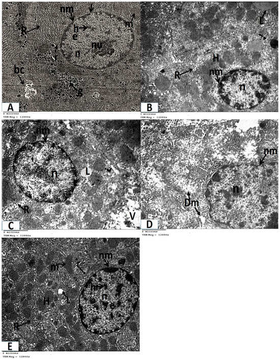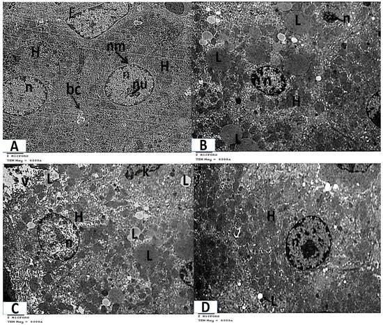 - Ultrathin sections of Group III (the azithromycin-treated group) revealed histopathological alterations in the hepatocytes. The most obvious result was the accumulation of many different-sized lipid droplets that were both electron-dense and electron-lucent throughout the hepatocytes’ cytoplasm. Some nuclei were small nuclei with thick nuclear envelopes and poorly defined nuclear pores. Other nuclei had high concentrations of electron-dense chromatin and were shrunken. The cytoplasm had a fragmented and dispersed rough endoplasmic reticulum, degenerated mitochondria with lost cristae, and vacuolated areas (Figure 4B,C and Figure 5B–D).