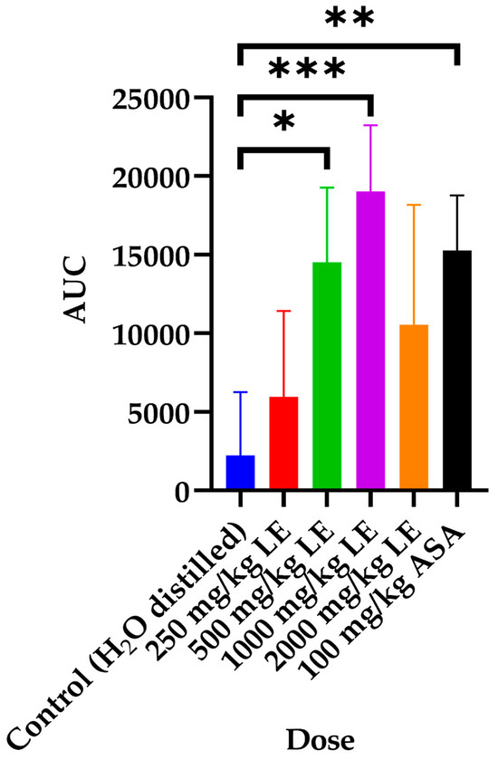 The area under the curve (AUC) 90 days after treatment: control, 250, 500, 1000, and 2000 mg/kg/d of LAE and 100 mg/kg/d ASA. An ANOVA was performed with a post hoc Dunnett to observe the differences between groups. The symbols indicate significant differences compared to control of * (p < 0.05), ** (p < 0.01), and *** (p < 0.001).