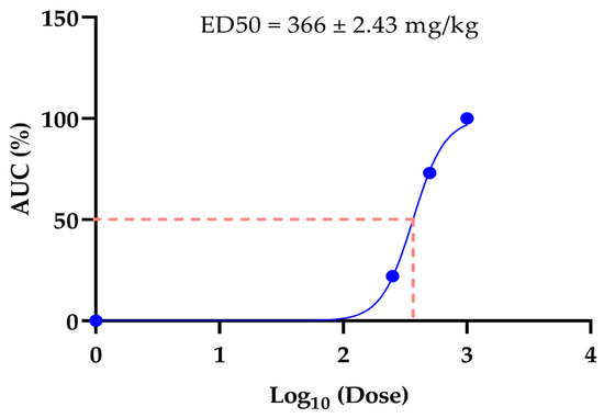 The in vivo ED50 was taken as an AUC, with a low dose of 250 mg/kg up to a high dose of 1000 mg/kg, since it showed significant differences from the control. The ED50 was 366 ± 2.43 mg/kg (see Figure 2).
