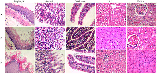 The male Wistar rats were sacrificed at 12 weeks via an overdose of pentobarbital, as indicated in NOM-0062-ZOO-1999 [32]. After death, the esophagus, stomach, duodenum, liver, and kidney were removed and placed in 10% paraformaldehyde for 24 h. Subsequently, for histological analysis, the tissues were embedded in paraffin (CTR Scientific, Monterey, Mexico), and the samples were cut at 4 microns using a microtome (Micro, Wetzlar, Germany), and stained with Hematoxylin (Jalmek, Mexico) and Eosin (Hycel, Mexico). Histopathological changes including inflammation and lymphoplasmacytic infiltration were observed under a Leica DM500 microscope (Heerbrugg, Switzerland), and the severity of the changes was marked by the pathologist using a score from 0 to 4 (0 = normal, 1 = minimal, 2 = moderate, and 4 = severe).