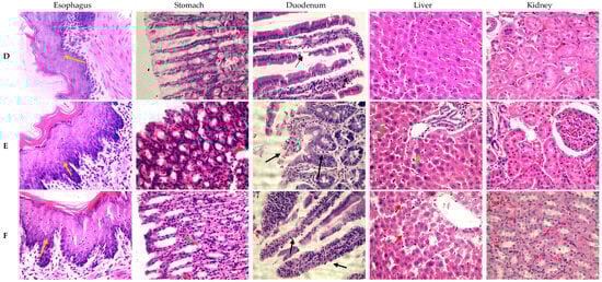 Comparison of the histopathological analysis of 90-day chronic toxicity with the doses and organs studied. The letters (A) indicate the control rats, (B) the doses of 250 mg/kg/d of LAE, (C) the doses of 500 mg/kg/d of LAE, (D) the doses of 1000 mg/kg/d of LAE, (E) the doses of 2000 mg/kg/d of LAE, and (F) the doses of 100 mg/kg/d of ASA. Black arrows indicate the duodenal ulcers; yellow arrows indicate acanthosis in the esophagus; green arrows indicate inflammatory infiltrate in the stomach and liver; red arrows indicate hemorrhage in the liver. A 40× lens was used in the microscope.