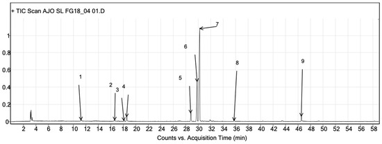 The genus Allium is characterized by an abundance of sulfur compounds. For this reason, we used GC-QToF-MS to identify the organosulfur compounds of LAE from the S. mountain garlic. Nine organosulfur compounds were identified, as shown in Table 2 and Figure 4.