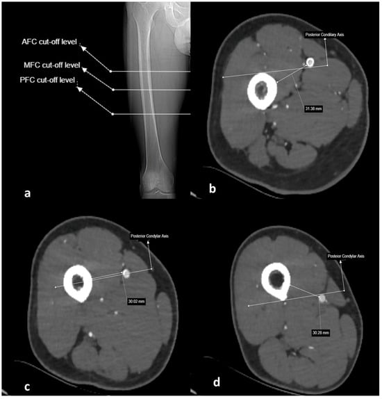 Anterior, medial, and posterior femoral cortex cut points for superficial femoral artery on coronal scanogram of right lower extremity CT angiography scan (a); perpendicular distance of SFA to femoral cortex on axial CTA images at AFC, MFC, and PFC levels (b–d).