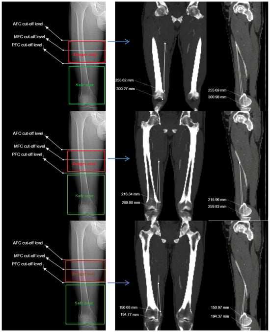 After the femoral artery (FA) branches into the deep femoral artery (DFA), it continues as the superficial femoral artery (SFA) and descends along the anteromedial line of the thigh within the femoral triangle. The SFA traverses the adductor canal and typically passes through the adductor magnus hiatus at the upper point of the distal third of the thigh, where it continues as the popliteal artery []. Although the SFA is located anteromedially to the femur in the proximal thigh, it shifts medially to the femur and ultimately assumes a posteromedial position as it descends. Along its course, the SFA is generally in close proximity to the femoral and saphenous nerves, which are highly susceptible to injury []. Due to its anatomical course, the SFA is at risk of injury during proximal and distal cross fixation, a standard surgical method for managing proximal femur and intertrochanteric fractures, as well as during intramedullary femoral nailing procedures [,,,]. Particularly, injuries to the SFA have been reported due to the placement of the fixation materials, such as external fixation pins, cerclage wires, plates, and screws, or as a result of bone fragments created during these procedures [,,,,]. Although an iatrogenic vascular injury resulting from these procedures is not common, the most common complications include laceration-induced bleeding, arterial occlusion, aneurysm, or arteriovenous fistula development [,,,,,,]. Understanding the course of the SFA and DFA, particularly their position relative to the medial femoral cortex (MFC), is critical for surgeons to predict the potential dangerous zones and exercise greater caution during surgical procedures, such as femoral shaft screw placement. During surgery, reference points, such as the adductor tubercle (AT), MFC, and medial femoral condyle plateau, which can be utilized under fluoroscopic guidance, can assist in identifying the safe and dangerous zones, thereby reducing the potential morbidity and the likelihood of failure. Minimizing complications remains a significant goal, and numerous studies have been conducted to elucidate the anatomical relationship between the femoral shaft and the FA to serve this purpose [,,,,,,]. Therefore, this study aimed to define the position of the SFA relative to the MFC using computed tomography (CT) in the Turkish population and to identify the safe and dangerous zones for proximal femur surgical procedures based on distance and proportional measurements, using anatomical reference points on the distal femur identifiable under fluoroscopy.