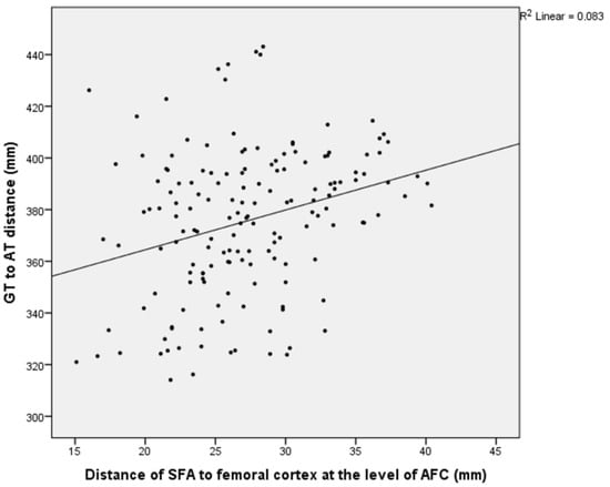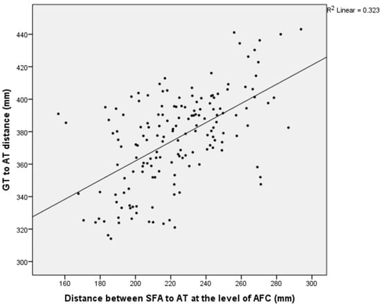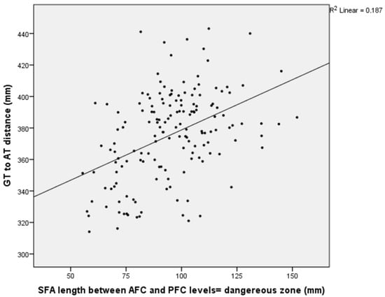 A statistically significant positive correlation of weak-to-moderate strength was identified between the distance from the SFA to the femoral AT and the femur length at the AFC, MFC, and PFC levels, as well as between the distance from the SFA to the MFC and the femur length at the same levels (p = 0.000, r = 0.276–0.568) (Table 6) (Figure 5, Figure 6 and Figure 7).