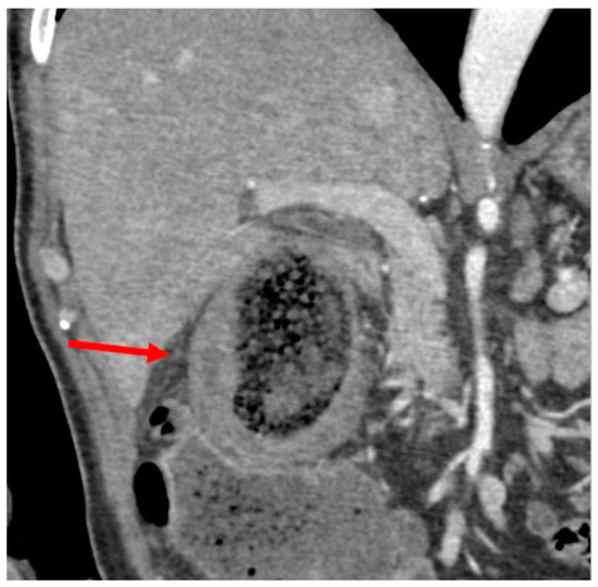 Computer tomography and MRI are therefore generally needed to evaluate local extent, nodal disease, and metastatic disease [43]. Computed tomography plays a crucial role in GBC staging, with a reported accuracy of up to 84% in determining the T stage (local extent) [114]. Additionally, CT scan has an 85% accuracy in predicting resectability, with precise depiction of direct hepatic or vascular invasion, lymphadenopathy, and distant metastasis [115]. Findings suggestive of GBC include gallbladder wall thickening with loss of its physiological trilaminar layering, an intraluminal mass, and lymphadenopathy. A hypodense area in the pericholecystic liver parenchyma may indicate the spread of the neoplastic disease. The absence of trilaminar layering, in conjunction with invasion of the liver parenchyma, is regarded as a highly suggestive indicator of advanced GBC. The homogeneous thickening of the gallbladder wall and the maintenance of its physiological layers are indicative of an acute inflammatory condition [116,117]. The triple-layer enhancement pattern observed with CT scan has been reported as useful for ruling out the presence of concomitant malignancy in acute cholecystitis [111]. Conversely, a two-layer pattern comprising a strongly enhancing thick inner layer and a weakly enhancing or non-enhancing outer layer, or a one-layer pattern comprising a heterogeneously enhancing thick layer, significantly associates with GBC [118]. In acute cholecystitis, the gallbladder is typically larger in volume than in GBC patients. However, the degree of wall thickening is more pronounced in malignant cases [111]. Regional fat stranding commonly associates with acute cholecystitis [117]. Despite the high reliability of CT examinations, it may still be challenging to obtain a definitive diagnosis of GBC based on imaging alone when inflammatory changes resulting from acute biliary pathologies are present. In the case of our patient, there were simultaneously signs suggestive of an acute inflammatory episode (i.e., enlarged gallbladder volume, diffuse wall thickening, regional fat stranding) and signs indicating a potential underlying malignancy (i.e., loss of physiological parietal layering, hypodense area in the pericholecystic liver parenchyma). Furthermore, the diffuse pattern of the malignancy presented a greater challenge to the preoperative diagnosis than would have been the case with a mass. Although MRI offers superior soft-tissue characterization of gallbladder and biliary tree than CT, its role in the management of acutely ill patients remains limited nowadays.