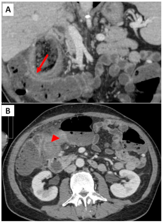 (A) CT scan: proximity of gallbladder wall, pericholecystic collection, and right colonic flexure (arrow); (B) CT scan: fat stranding of the pericholecystic tissue (arrowhead).