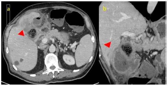 (a) CT scan: hypodense area (arrowhead) of the pericholecystic liver parenchyma, suggestive of invasion; (b) Coronal CT slice.