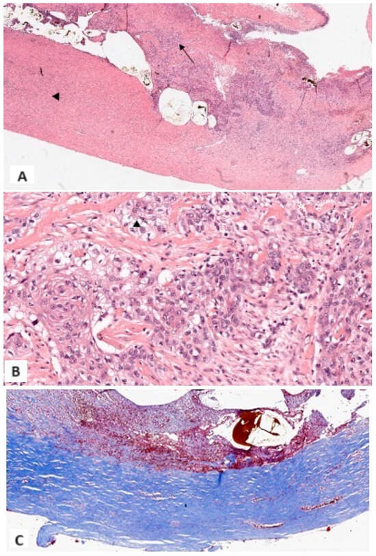 (A) At lower magnification, xanthocholegranulomatous inflammation (arrow), lamellar hyaline fibrosis (arrowhead), ulceration, and fibrin deposits, with widespread loss of epithelium (1×, Hematoxylin and Eosin); (B) Malignant squamous cells separated by dense and scattered fibrosis. Aspects with clear cytoplasm were documented (13×, Hematoxylin and Eosin); (C) Dense lamellar fibrosis with loss of the fibromuscular layer. No dystrophic calcifications were identified (6×, Masson Trichrome Stain).