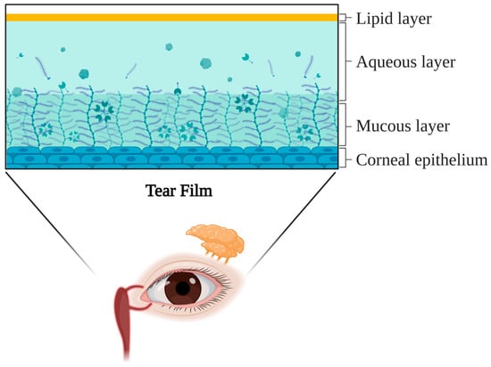 Among the ocular surface components that maintain the refractive quality, the tear film is the most dynamic [18]. A stable tear film is crucial for ocular health, providing corneal lubrication and serving as the primary refractive surface [19]. Traditionally, the tear film has been described as having three distinct layers (Figure 1): a lipid layer that prevents evaporation, an aqueous layer that supplies lubrication and nutrients, and mucin layers that anchor the hydrophilic aqueous layer to hydrophobic epithelial cells [20]. More recently, a two-layer model has gained acceptance, which consists of a lipid layer overlying a mucoaqueous layer that makes up the majority of the tear film [19]. The lacrimal glands produce most of the tear volume, while the meibomian glands secrete meibum to form the lipid layer [19].