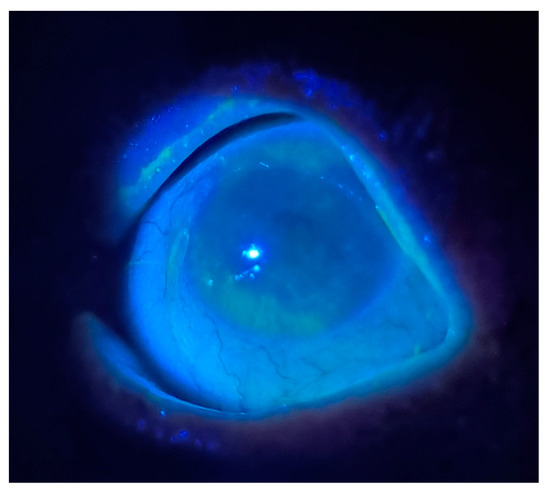 Figure 2. Gross examination of DED in 68-year-old female patient with Sjögren’s syndrome and rheumatoid arthritis. Fluorescein was applied on lower conjunctival sac and blue light from ophthalmoscope was illuminated in dark room to visualize corneal damage. - Eyelid Structure: Although a microscopic eyelid examination is not feasible in the primary care settings, certain structural and functional abnormalities associated with DED can be identified grossly with the naked eye [60]. These include entropion (inward turning of the eyelid), ectropion (outward turning of the eyelid), incomplete eyelid closure, and trichiasis (eyelashes touching the ocular surface).