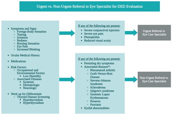 An overview of DED diagnostic tests for PCPs and indicators for non-urgent and urgent referrals to an eye care specialist. * The associated diseases listed on Figure 3 are not exhaustive of all possible autoimmune diseases.