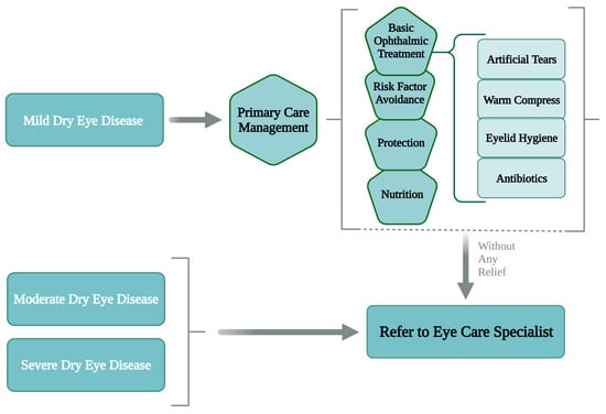 DED can be managed in a primary care setting through basic ophthalmic treatment, risk factor avoidance, protection, and nutritional support (Figure 4). The methods described here are most effective for mild dry eye conditions. However, moderate to severe conditions require additional specialist visit and advanced treatment [80].