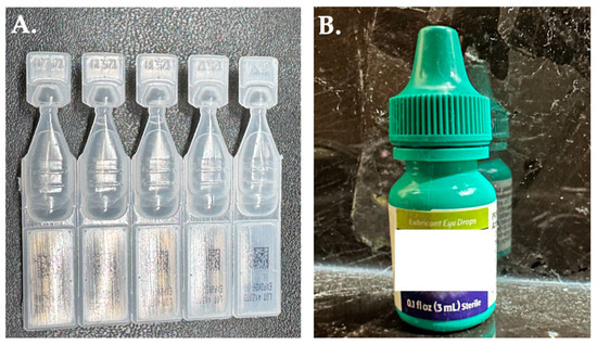 Figure 5. Comparison of artificial tears (A) without preservatives (B) with preservatives. (A). Preservative-free artificial tears are typically packaged in single-use vials. (B) The multi-dose preservative artificial tears are packaged in an eye drop bottle. - Warm Compress: Warm compresses can alleviate MGD and promote meibum secretion [34]. This helps maintain the healthy lipid layer, which is essential in preventing excessive tear evaporation.